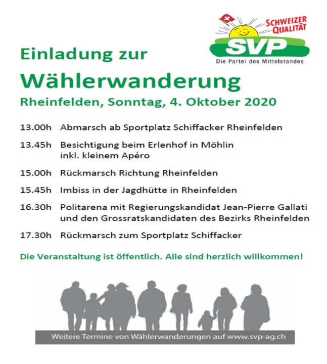 Wir laden Sie ganz herzlich zur Wählerwanderung am 4. Oktober ein. Am Anlass werden viele Personen teilnehmen, welche im Bezirk stark verankert sind. Daneben wir unser Regierungsratskandidat Jean Pierre Gallati auch am Anlass teilnehmen. Weitere Informationen finden Sie im Anhang.